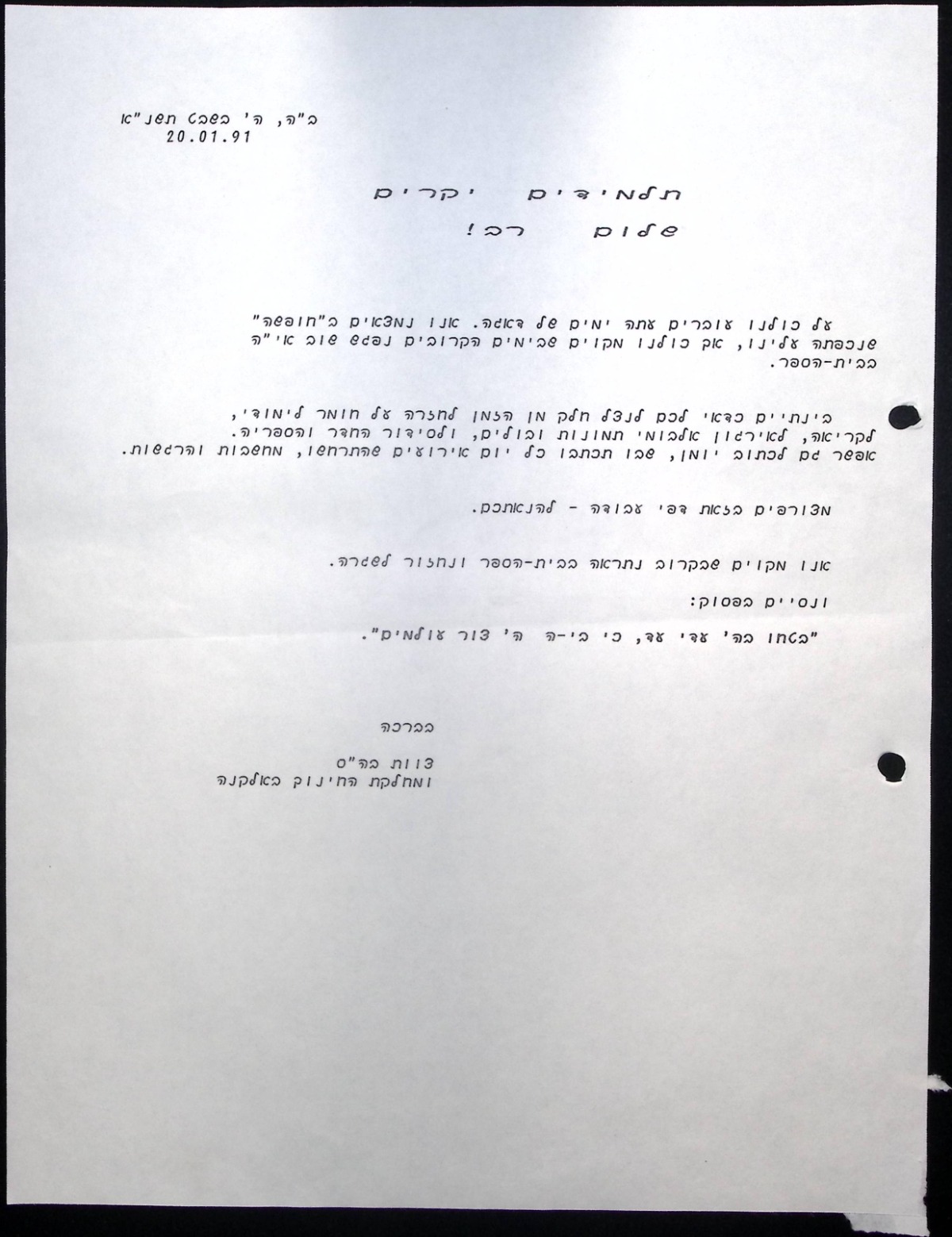 אגרת לתלמידים (20/01/1991)