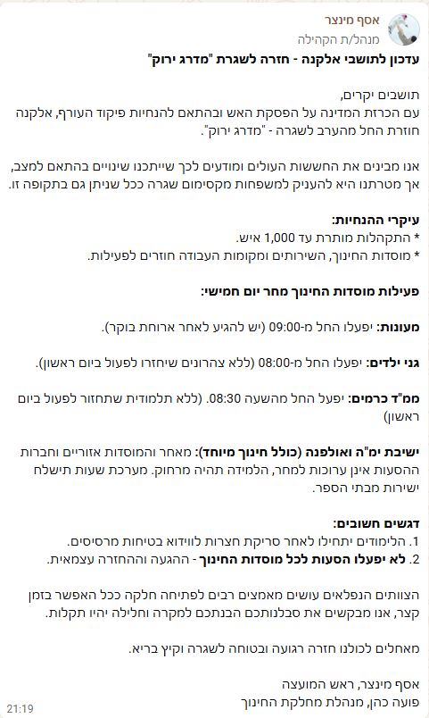 הודעת המועצה על חזרה מדורגת לשגרה בעקבות ההכרזה על הפסקת אש. (08/04/2026 בשעה 21:19)